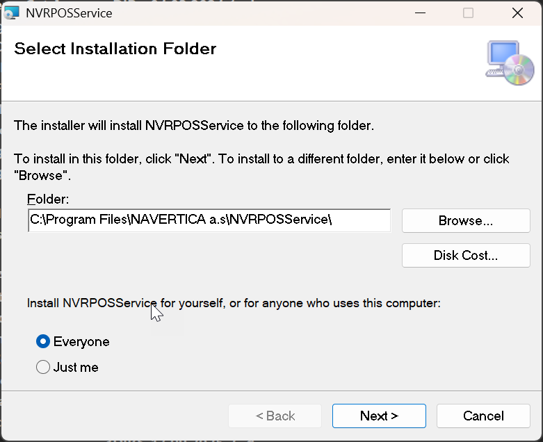 - Installation folder - choose the folder where you want to install the service, default is C:\Program Files\NAVERTICA a.s.\NVRPOSService, click Next