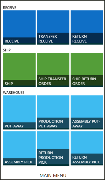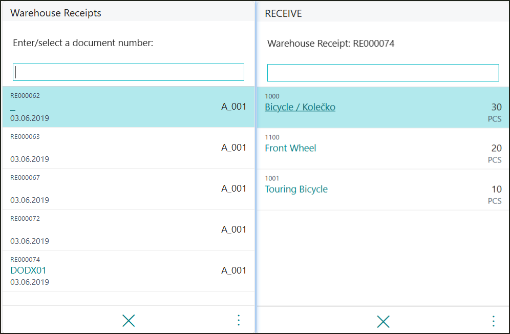 Receive Items by using Warehouse Receipts. The user selects the Receipt function