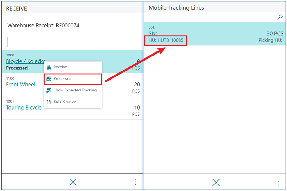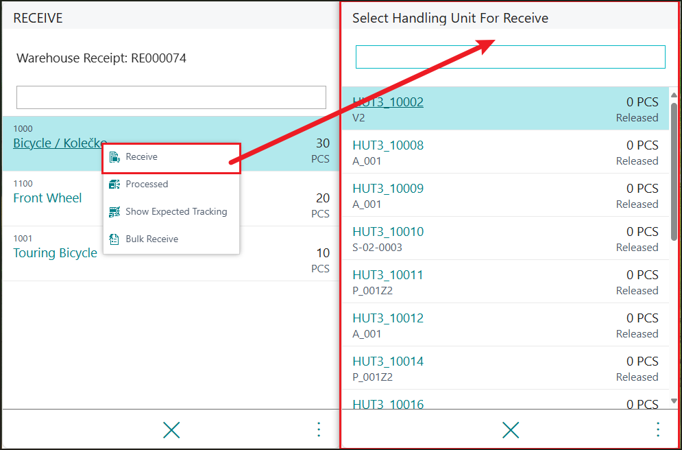 they select the item line they want to receive, and after confirmation, a window for entering the Handling Unit appears first. The user either selects the handling unit (it can be scanned with a reader), into which the items will be recorded,