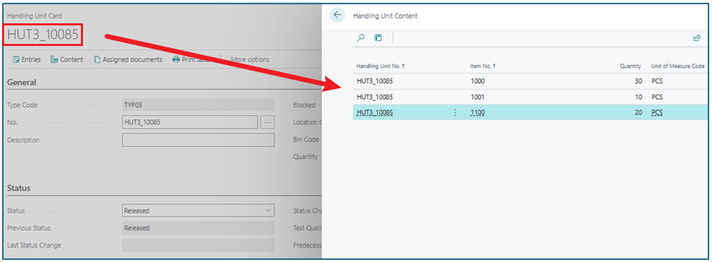 Subsequently, under the Processed action, it is possible to view from which HU the items are taken and into which HU they are placed.