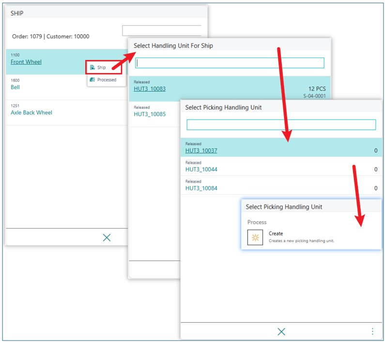Above the item in the document, the user selects the Ship action and a list of HUs where the items are located is displayed. The list shows the HU number, the quantity of items on the HU, and the bin identification. After selecting the HU from which the items will be taken, the user must specify into which HU the items will be placed (either selecting an existing one or creating a new one).